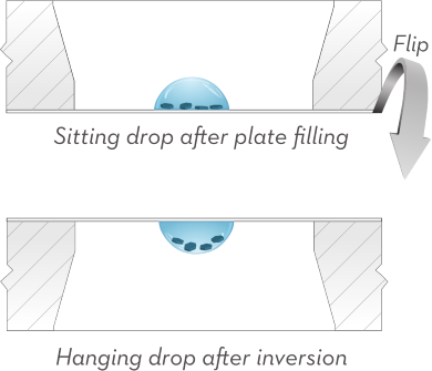The plate can be flipped over to create a 96 well hanging drop experiment.